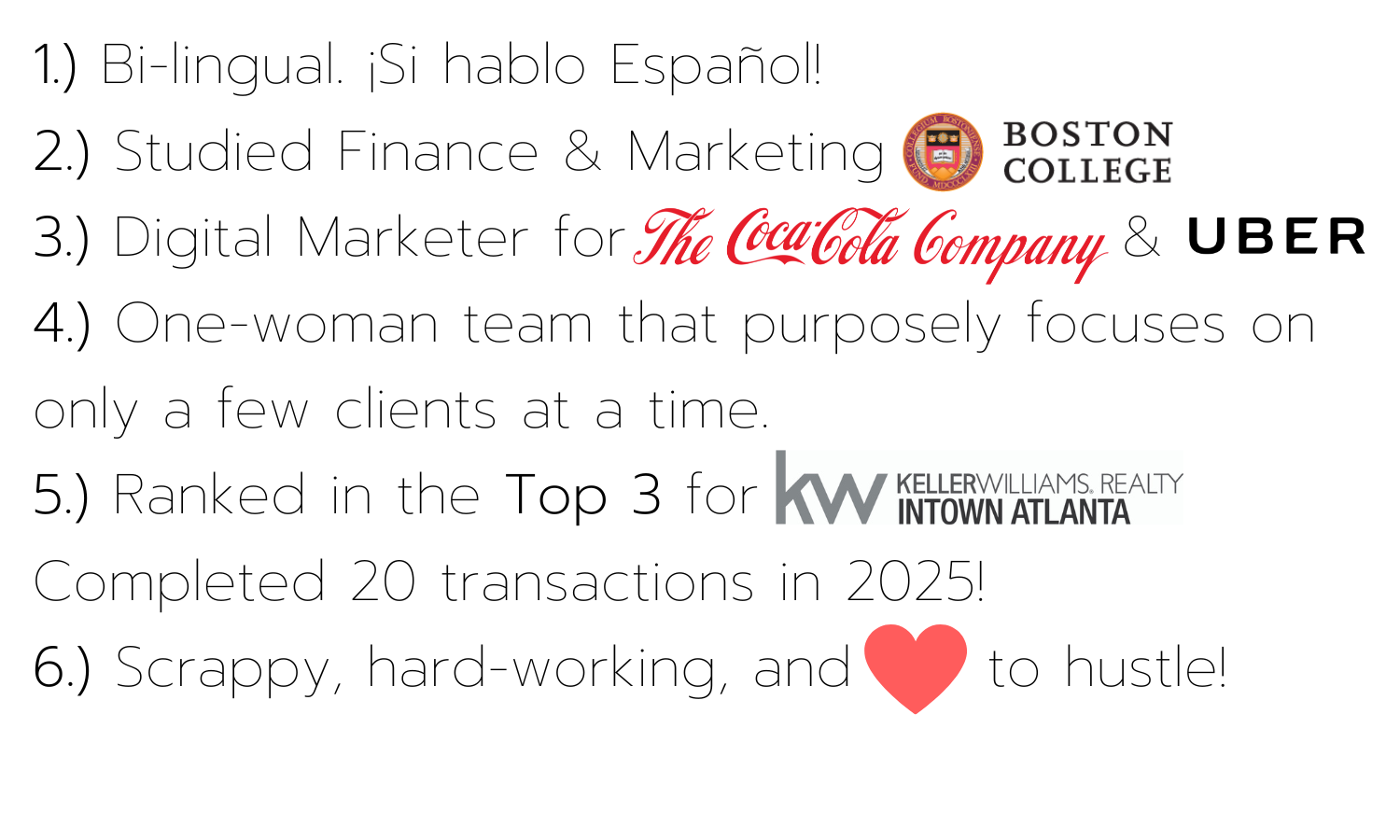 And now for a little bit about me. I am originally an Orlando girl but went to school at Boston College where I studied marketing and finance. From there, I worked for The Coca-Cola Company in Bolivia and at their headquarters here in Atlanta. I also worked for Uber as their marketing lead for the Southeast Region. While I enjoyed my time in the corporate world and will be forever thankful for the experiences that I gained, real estate has and always will be my passion!